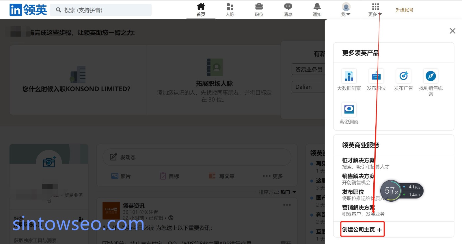 第一步:登錄領(lǐng)英官網(wǎng),點擊右上角“更多”下拉菜單,點擊“創(chuàng)建公司主頁”